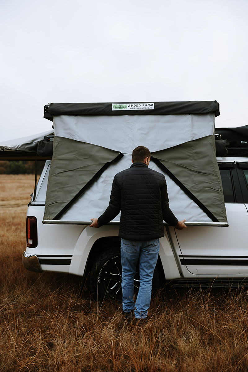 Unser BunduAnnex (zusätzlicher Raum) folgt den gleichen Produktrichtlinien – Benutzerfreundlichkeit. Er bietet einen privaten Eingang zu Ihrem Dachzelt und hält den Regen ab. Er hat oben auf jeder Seite Öffnungen, die aufgrund seiner Beschaffenheit nicht dauerhaft geschlossen werden können. Die Seitenwand, mit der es geschlossen wird, ist ein einfaches Design, das Privatsphäre bietet.